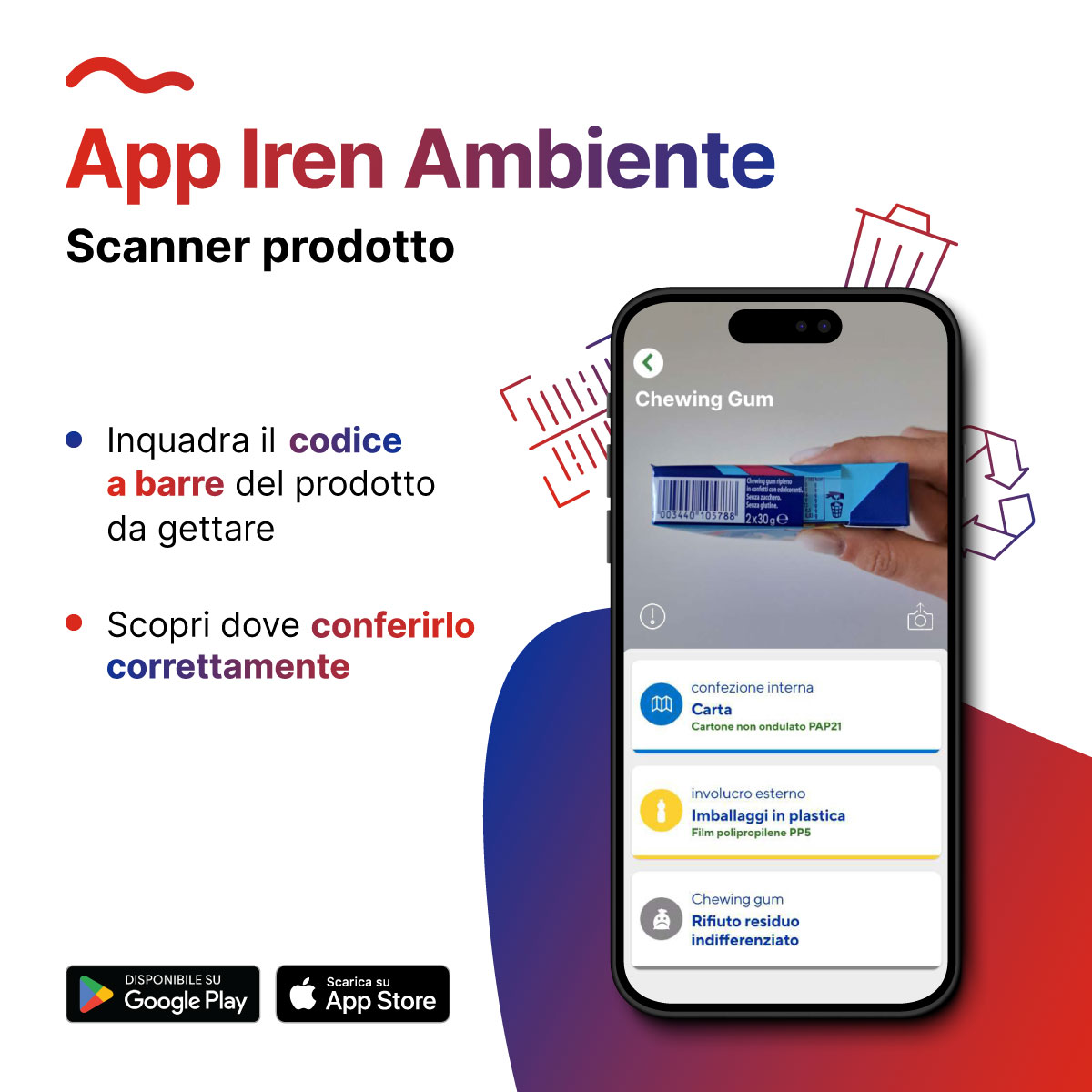 - aiuta a differenziare i rifiuti con facilità: inquadrando il codice a barre o usando la funzione di ricerca per scoprire dove e come smaltire ogni prodotto